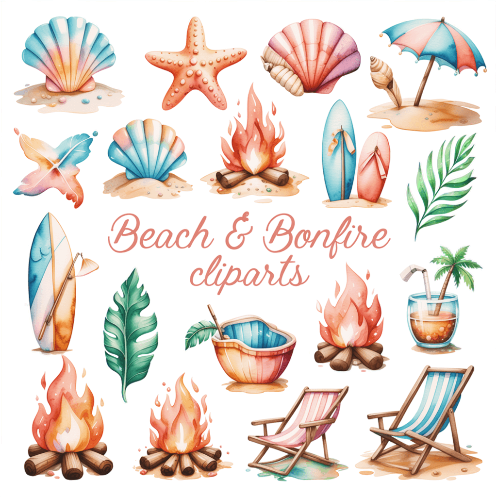 440 Beach & Bonfire Clipart Bundle includes high-quality, ready-to-use summer-themed illustrations featuring beaches, bonfires, sunsets, palm trees, and cozy coastal vibes.